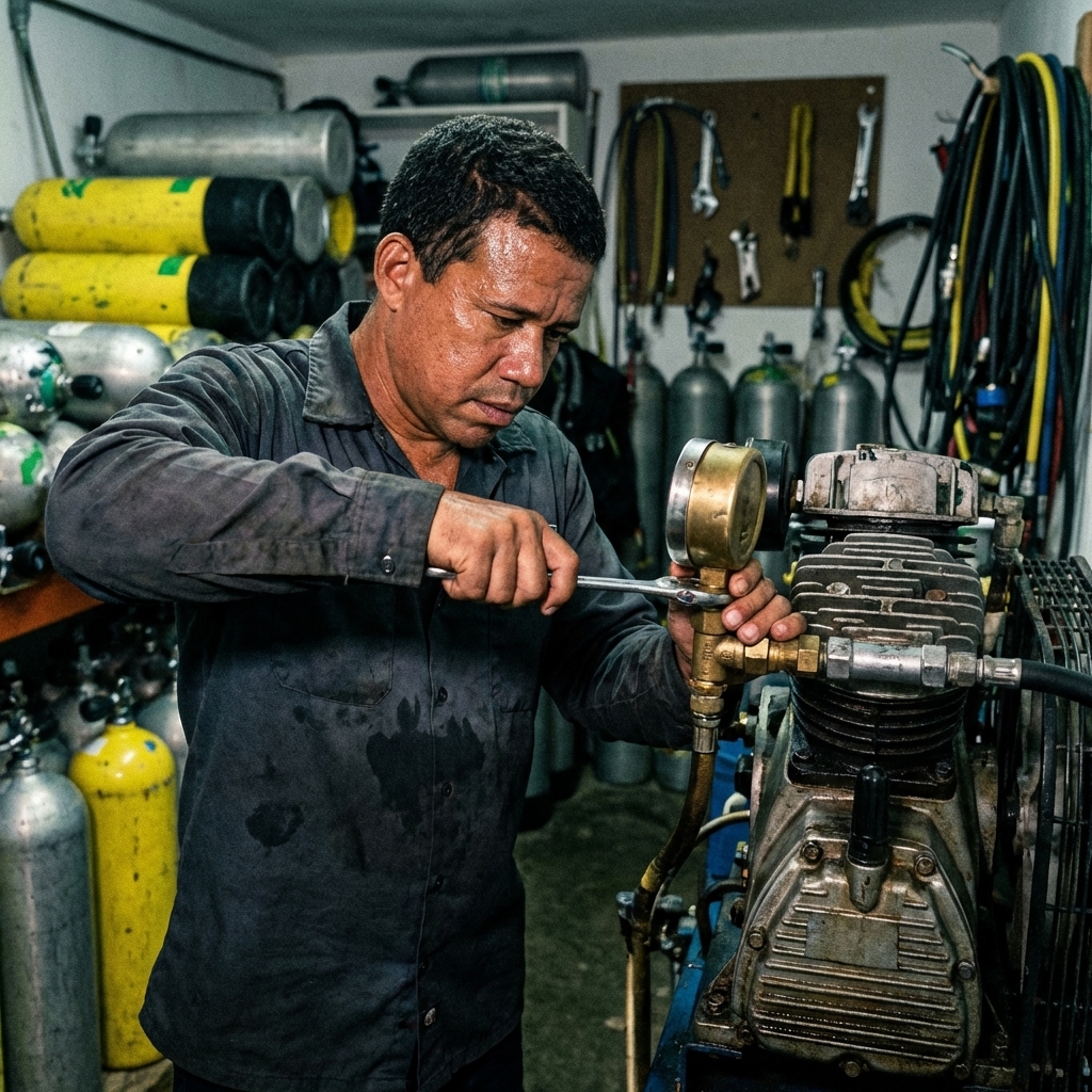 Inmediatamente después de asegurar la liberación y el cuidado de sus animales, Daniel se dirige al corazón técnico de su operación. En Providencia, donde los ritmos son flexibles, la disciplina de Daniel es inflexible. Su primer acto en Sirius Dive Shop es garantizar la perfección del aire que mantendrá vivos a sus buzos.