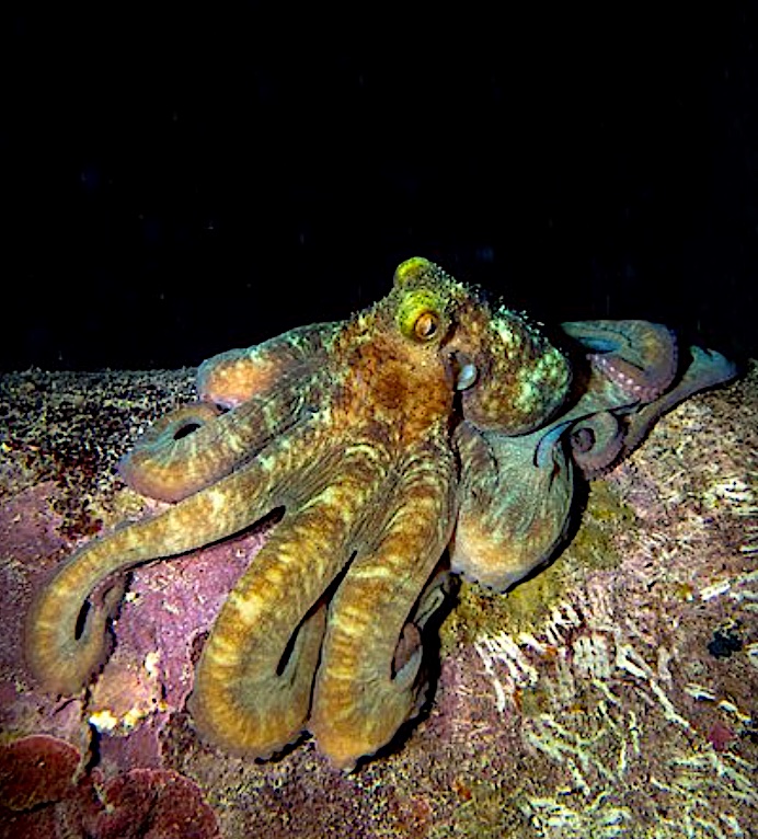 Bucear de noche es adentrarse en un universo paralelo donde las reglas del sol desaparecen. Otro tipo de vida marina, increíblemente colorida y siempre ocupada, toma el control del arrecife. Esa noche, nuestra tripulación hizo una apuesta en el bote: el primero que encontrara un pulpo, compraba una botella de vino al salir para compartir. El juego había comenzado. Aunque no bebo alcohol, me llenó de adrenalina ser el primero en avistar uno entre las rocas (y sí, cumplí con mi parte del trato). >