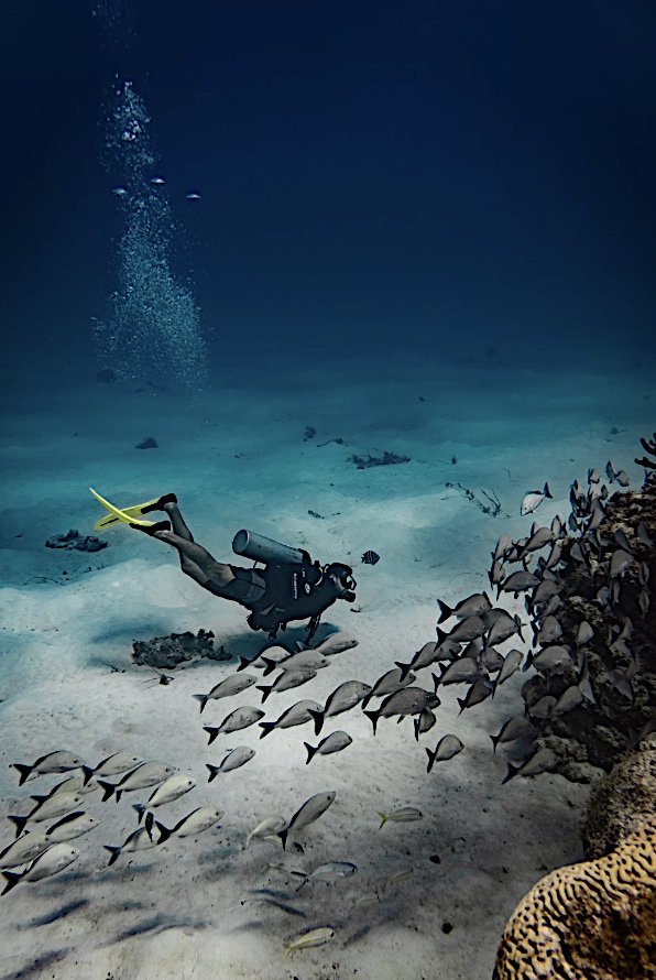 Pero no todas las obras maestras están en la oscuridad. El lugar favorito de Daniel para convertir a los neófitos en adictos al buceo es Tetes Place, un sitio poco profundo, a solo 9 o 10 metros. A esta profundidad, la luz del sol penetra perfectamente, haciendo que los colores del arrecife exploten y creando condiciones ideales tanto para principiantes como para fotógrafos submarinos; tiene un fondo de arena que funciona como un imán.